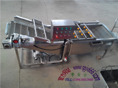 2、蔬菜清洗機(jī):該機(jī)用于挑選好的蔬菜進(jìn)行清洗,把泥沙、雜草以及異物清洗干凈出來,采用鼓風(fēng)機(jī)通過管道吹進(jìn)水槽里面,將水達(dá)到翻騰的狀態(tài),模擬手工清洗,不會(huì)對(duì)蔬菜造成損害,達(dá)到清洗的效果,水槽旁邊有溢水口,溢水口上端設(shè)有過濾網(wǎng)裝置,清洗下來的雜草異物通過溢水口,清理出來,溢水口底部設(shè)有過濾裝置,水在循環(huán)的情況下可以將底部的泥沙等雜物過濾出來,水在循環(huán)的過程中不會(huì)再次進(jìn)入到水槽和把排水口阻死的現(xiàn)象,排污口設(shè)計(jì)合理,可根據(jù)客戶的要求,安排位置。整機(jī)為SUS304不銹鋼材質(zhì)制造,符合我國對(duì)食品衛(wèi)生的需求。