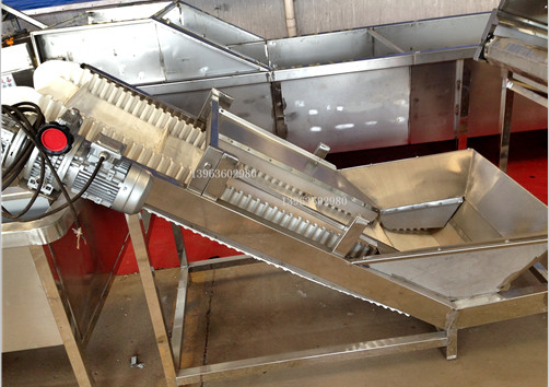 7、提升機(jī):通過振動(dòng)瀝水將大量的水滴去除掉,由提升機(jī)提升到下一道工序。傳送帶為PVC食品級(jí)材質(zhì),完全符合我國對(duì)食品衛(wèi)生的需求。