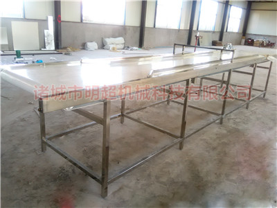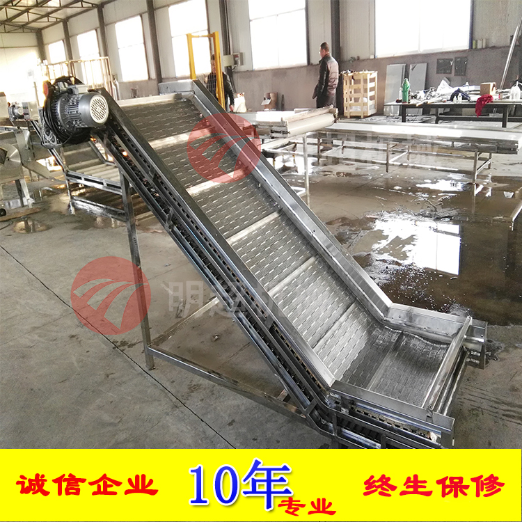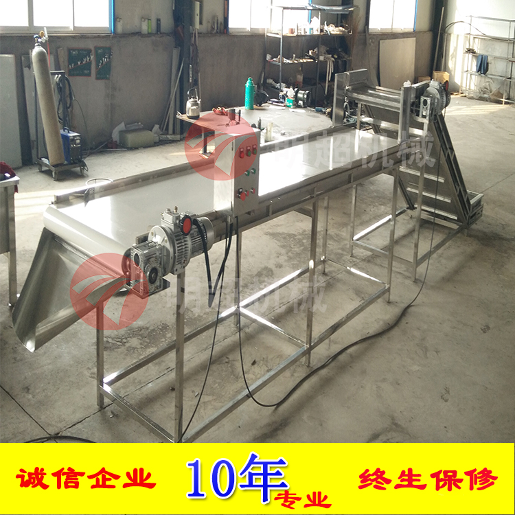 該機(jī)采用雙層進(jìn)行輸送,上面一層采用pvc輸送,當(dāng)蔬菜輸送到中間之后,通過(guò)強(qiáng)制分離裝置,分離到切菜機(jī)入口,當(dāng)蔬菜從切菜機(jī)入口進(jìn)入到里面,切完后再通過(guò)底層的第二層不銹鋼網(wǎng)帶輸送提升到下一工序,運(yùn)行速度可調(diào)。