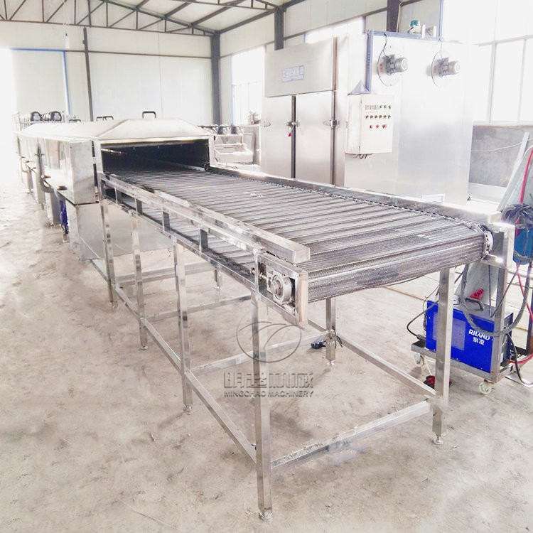 1、工藝流程:原料清洗去泥沙→噴淋清洗→風(fēng)干機→烘烤設(shè)備→速凍