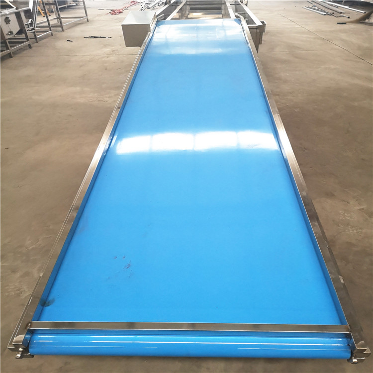 4、噴淋清洗機:通過紅薯清洗機遍沖洗,在通過網(wǎng)帶輸送到紅薯噴淋清洗機,通過多個噴嘴對紅薯表面褶皺殘留的細(xì)小泥沙清洗干凈,通過多道噴淋管道進行沖洗,底部設(shè)有多個水箱,水箱里面的水可循環(huán)利用,每個水箱都是獨立的,不會跟其他水箱里面的水連接,這樣就有效的保證了紅薯的完整度,表皮不受損失,前面紅薯清洗機跟噴淋清洗機為一條網(wǎng)帶,也是保證紅薯完整度的首要條件。
