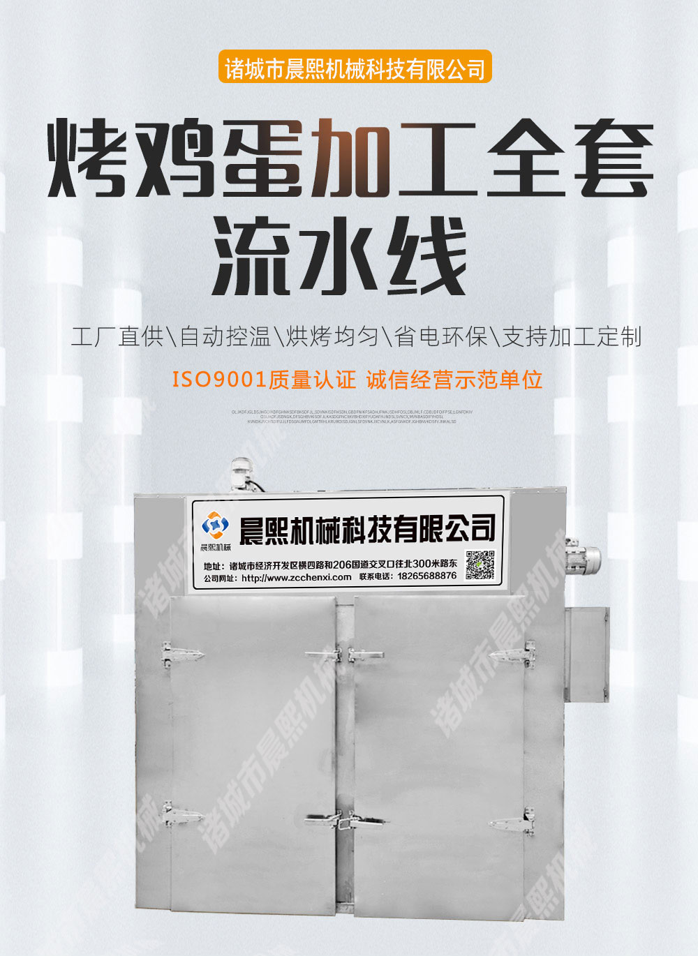 韓式即食雞蛋烘烤流水線 蛋黃烘烤箱是目前市面上新型雞蛋烘烤設(shè)備,是實(shí)現(xiàn)財(cái)務(wù)自由的首選設(shè)備,加工烤雞蛋需要經(jīng)過清洗,殺菌,蒸煮,光檢,瀝水,腌制,烘烤,包裝,攤涼等工序完成,現(xiàn)在烤蛋機(jī)工藝有幾種一種是直接烘烤帶皮生雞蛋,另外一種是鹵制后進(jìn)行烘烤脫皮后烤雞蛋,工藝多種多樣,不同工藝配不同的設(shè)備,那么烘烤時(shí)間多少,烘烤溫度多少這需要根據(jù)每個(gè)烤蛋工藝不同可以調(diào)試,今天咱們只介紹雞蛋烘烤流水線,加工雞蛋鴨蛋需要人工把不合格的雞蛋鴨蛋挑選出來,然后工人經(jīng)過清洗后采用電加熱方式,讓雞蛋受熱均勻,達(dá)到烘烤的目的,烤盤尺寸:640*460*45mm,烤雞蛋設(shè)備有24盤,48盤,96盤,144盤,192盤,288盤等等,采用恒溫烘烤,烘烤上下左右中間一致,我們采用高溫高濕防爆風(fēng)機(jī)將新鮮的空氣抽到烘烤箱內(nèi)通過分封板將加熱管產(chǎn)生的熱氣循環(huán)于烘烤箱內(nèi),熱氣圍繞著每一個(gè)雞蛋和鴨蛋慢慢的將里面的濕氣排出產(chǎn)生氣體后,在通過排濕風(fēng)機(jī)將濕氣排出,這樣周而復(fù)始慢慢的雞蛋鴨蛋就烘烤出來我們想要的樣子了,雞蛋烘烤過程中無需人工操作,無需翻料,節(jié)省人工,自動(dòng)烘干自動(dòng)排濕自動(dòng)烘烤后自動(dòng)報(bào)警,自動(dòng)斷電,控制箱可選用數(shù)字觸摸屏,PLC等方式,具體可詳談,價(jià)格也是從幾千到十幾萬不等,下單前請先跟我們聯(lián)系,下面我們來看看雞蛋烘烤流水線,蛋黃烘烤箱加工需要全套設(shè)備有哪些,