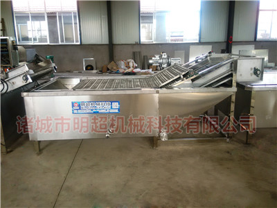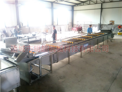 一般來說,根莖類作物凈菜加工流水線包括以下設(shè)備挑選輸送帶→提升機(jī)→加高去皮毛輥清洗機(jī)--氣泡清洗機(jī)→消毒殺菌清洗機(jī)→高壓噴淋清洗機(jī)---多功能蔬菜分切機(jī)→漂燙冷卻機(jī)→風(fēng)干瀝水機(jī)---傳送帶等設(shè)備組成,具體組成設(shè)備根據(jù)客戶工藝來訂制。